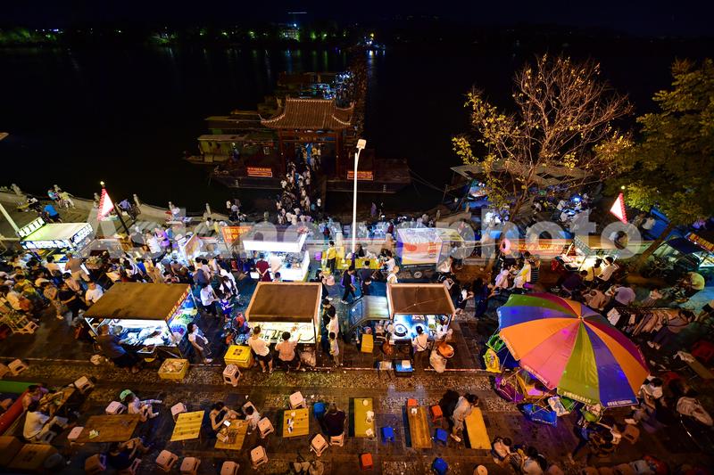图片说明:2022年8月3日,市民在江西省赣州市章贡区东河浮桥夜市打卡游玩。