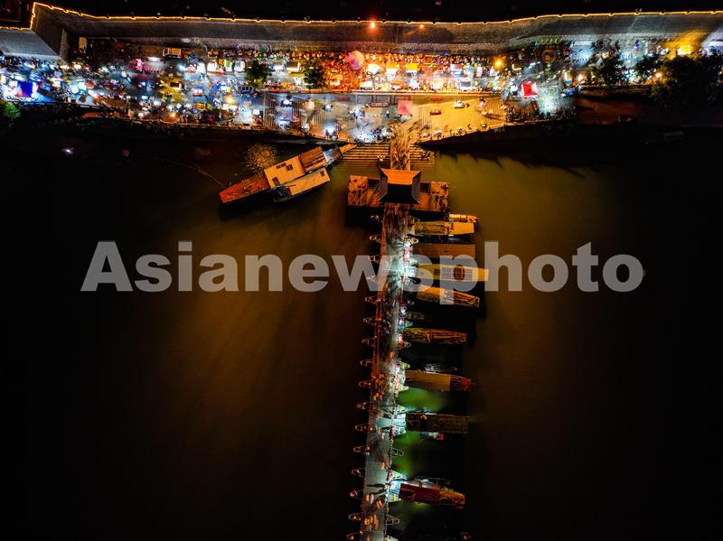 图片说明:2022年8月3日,市民在江西省赣州市章贡区东河浮桥夜市打卡游玩。