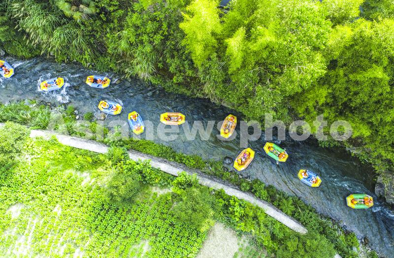 图片说明:2022年8月3日,浙江省杭州市淳安县富文乡王子谷漂流点,游客在峡谷河流上漂流,享受酷暑中的清凉。