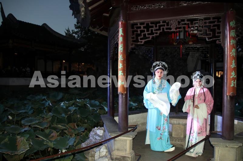 2022年8月4日晚,演员在苏州古典园林狮子林为游客表演昆曲《牡丹亭》。