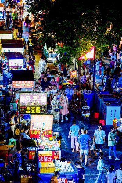 图片说明:2022年8月3日,市民在江西省赣州市章贡区东河浮桥夜市打卡游玩。