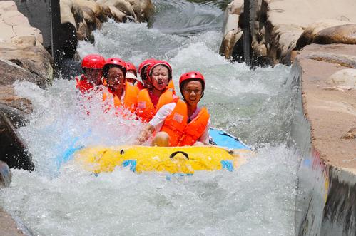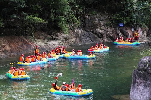 2022年8月6日,湖南省郴州市宜章县莽山国家森林公园景区,游客在莽山大峡谷河流上漂流。
