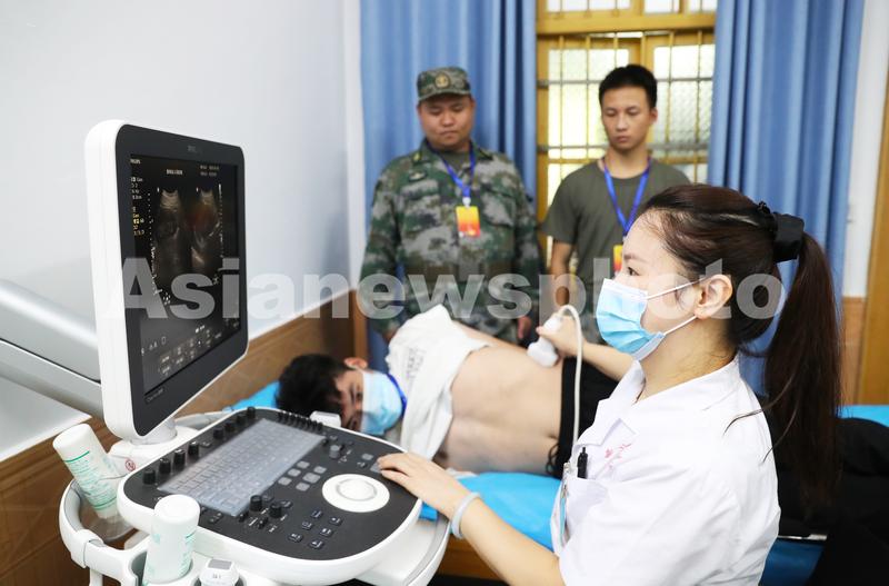 图片说明:2022年8月10日,湖南省永州市新田县人民医院体检中心,参加征兵入伍的适龄青年正在进行体检。