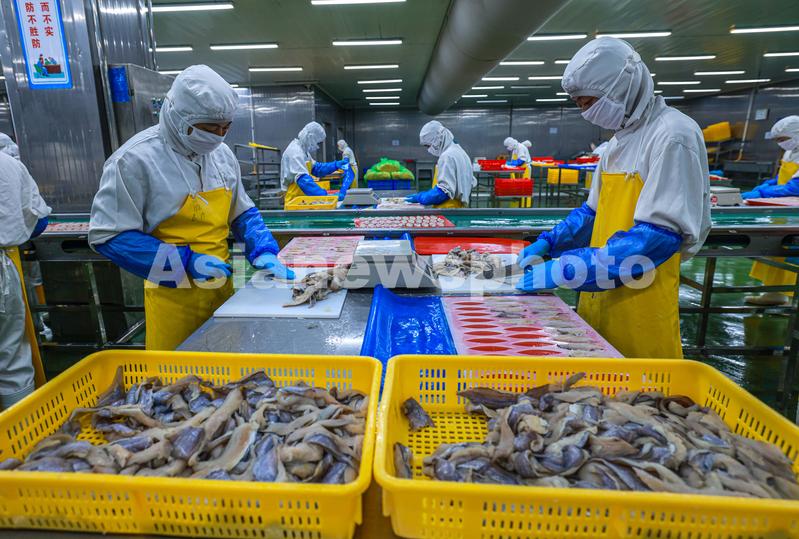 图片说明:2022年8月11日,在山东省荣成市石岛管理区一家海洋食品加工出口企业的生产车间内,工人们在加工各类鱼肉制品。