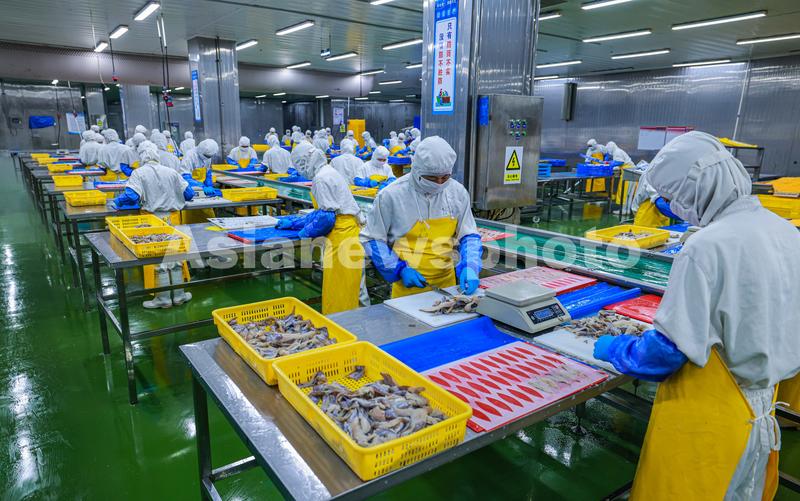 图片说明:2022年8月11日,在山东省荣成市石岛管理区一家海洋食品加工出口企业的生产车间内,工人们在加工各类鱼肉制品。