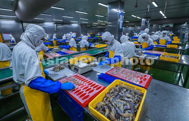 图片说明:2022年8月11日,在山东省荣成市石岛管理区一家海洋食品加工出口企业的生产车间内,工人们在加工各类鱼肉制品。