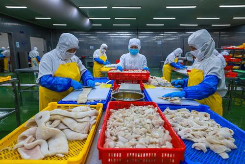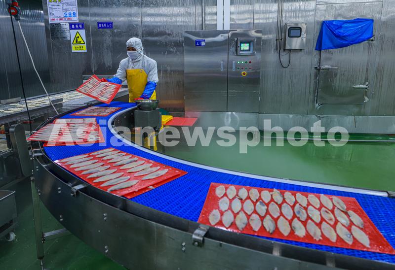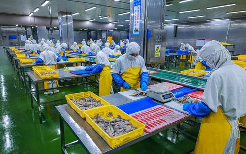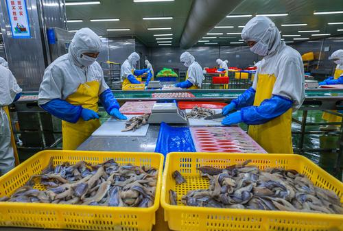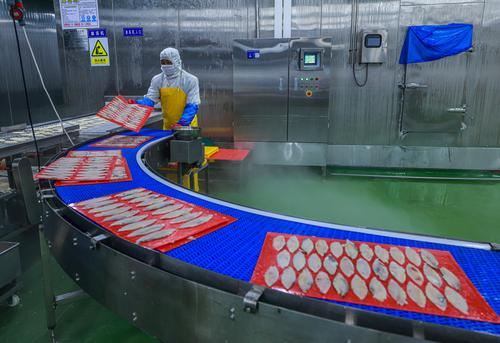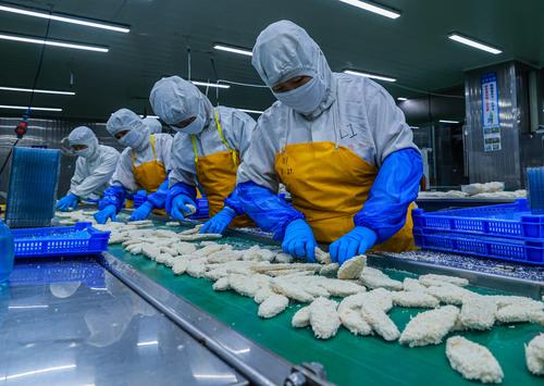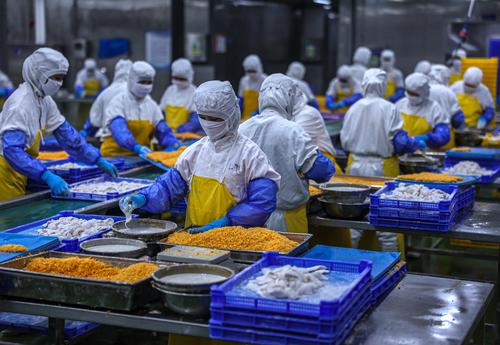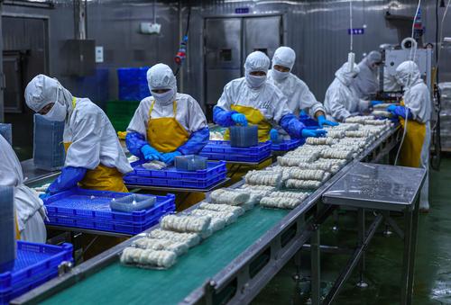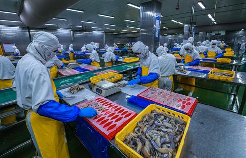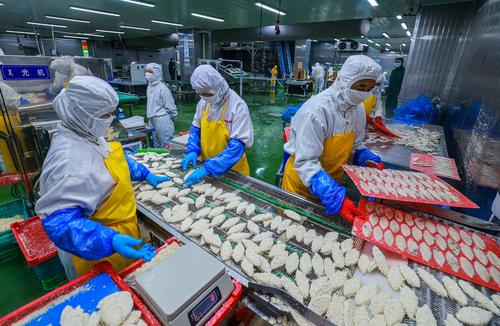图片说明:2022年8月11日,在山东省荣成市石岛管理区一家海洋食品加工出口企业的生产车间内,工人们在加工各类鱼肉制品。