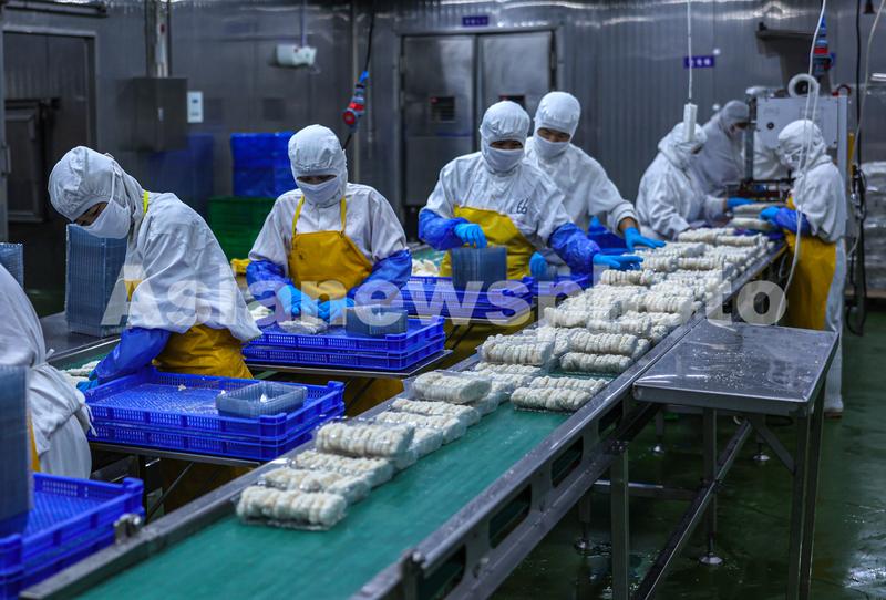 图片说明:2022年8月11日,在山东省荣成市石岛管理区一家海洋食品加工出口企业的生产车间内,工人们在加工各类鱼肉制品。