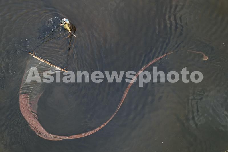 2022年8月15日,山西运城,工人们在盐湖里捞取卤虫。航拍镜头下,他们拖着长15-20米的捞虫网不停地在湖水中游走,宛如水中舞长龙。卤虫也叫丰年虾,俗称盐水虫,是一种生存于陆地盐田和盐湖中的生物,每年入夏后会大量繁殖,是鱼虾的重要饵料,被称水体“软黄金”。