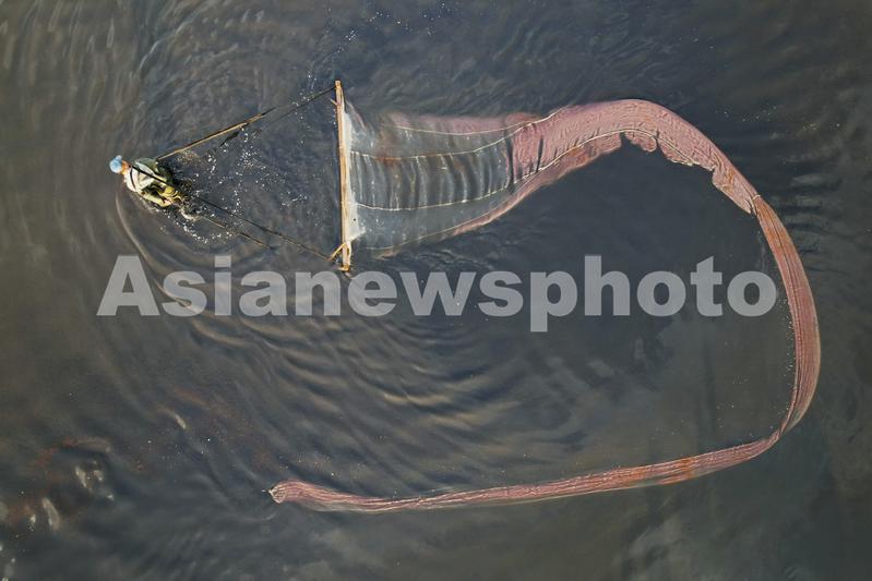 2022年8月15日,山西运城,工人们在盐湖里捞取卤虫。航拍镜头下,他们拖着长15-20米的捞虫网不停地在湖水中游走,宛如水中舞长龙。卤虫也叫丰年虾,俗称盐水虫,是一种生存于陆地盐田和盐湖中的生物,每年入夏后会大量繁殖,是鱼虾的重要饵料,被称水体“软黄金”。