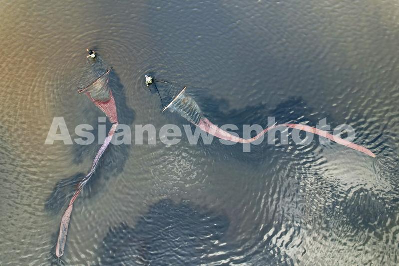 2022年8月15日,山西运城,工人们在盐湖里捞取卤虫。航拍镜头下,他们拖着长15-20米的捞虫网不停地在湖水中游走,宛如水中舞长龙。卤虫也叫丰年虾,俗称盐水虫,是一种生存于陆地盐田和盐湖中的生物,每年入夏后会大量繁殖,是鱼虾的重要饵料,被称水体“软黄金”。