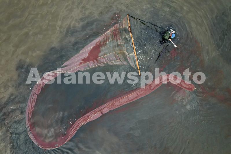 2022年8月15日,山西运城,工人们在盐湖里捞取卤虫。航拍镜头下,他们拖着长15-20米的捞虫网不停地在湖水中游走,宛如水中舞长龙。卤虫也叫丰年虾,俗称盐水虫,是一种生存于陆地盐田和盐湖中的生物,每年入夏后会大量繁殖,是鱼虾的重要饵料,被称水体“软黄金”。