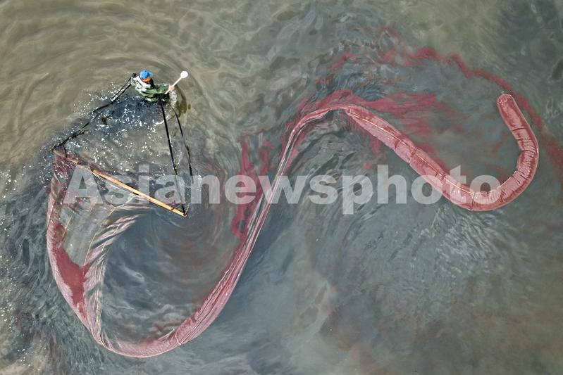 2022年8月15日,山西运城,工人们在盐湖里捞取卤虫。航拍镜头下,他们拖着长15-20米的捞虫网不停地在湖水中游走,宛如水中舞长龙。卤虫也叫丰年虾,俗称盐水虫,是一种生存于陆地盐田和盐湖中的生物,每年入夏后会大量繁殖,是鱼虾的重要饵料,被称水体“软黄金”。