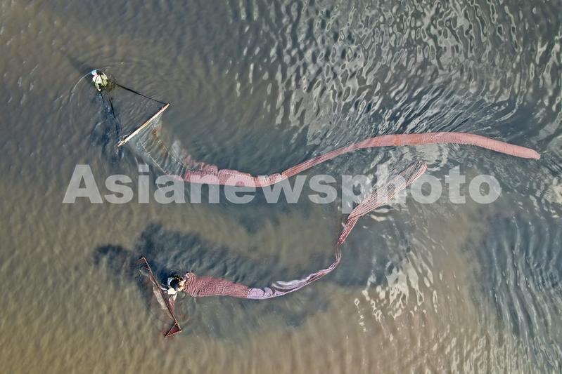 2022年8月15日,山西运城,工人们在盐湖里捞取卤虫。航拍镜头下,他们拖着长15-20米的捞虫网不停地在湖水中游走,宛如水中舞长龙。卤虫也叫丰年虾,俗称盐水虫,是一种生存于陆地盐田和盐湖中的生物,每年入夏后会大量繁殖,是鱼虾的重要饵料,被称水体“软黄金”。