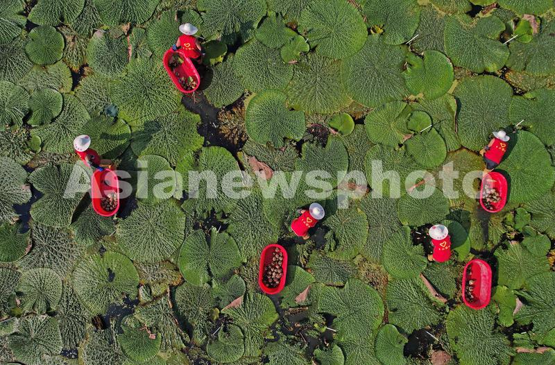 2022年8月12日,常州市天宁区武城村,农户们正在忙着采收芡实。今年,武城村鸡头米种植面积达25亩,平均亩产75公斤左右,帮助当地农户创造良好的收益。