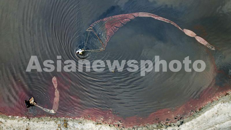2022年8月15日,山西运城,工人们在盐湖里捞取卤虫。航拍镜头下,他们拖着长15-20米的捞虫网不停地在湖水中游走,宛如水中舞长龙。卤虫也叫丰年虾,俗称盐水虫,是一种生存于陆地盐田和盐湖中的生物,每年入夏后会大量繁殖,是鱼虾的重要饵料,被称水体“软黄金”。