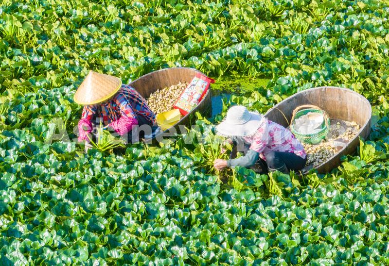 图片说明:2022年8月15日,江苏省海安市白甸镇周垛村的村民划着菱桶在水面采菱。