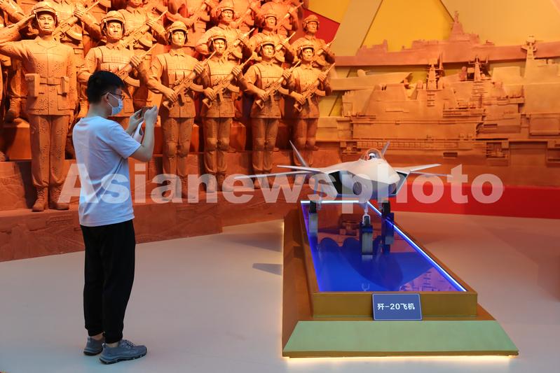 8月16日,媒体记者在展览现场拍摄展出的歼-20飞机模型。