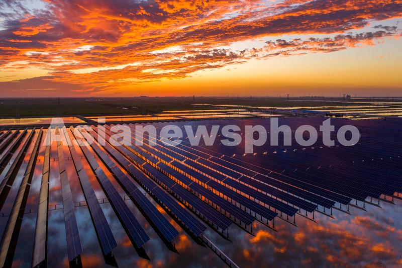 8月15日,在山东省滨州市无棣县的沿海滩涂上,晚霞映照下的光伏电站。