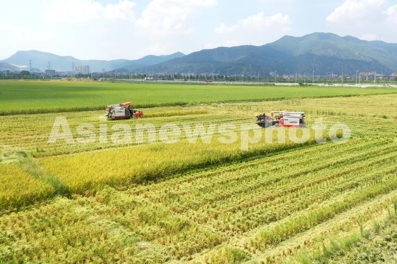 2022年8月16日,福建省福州市长乐区竹田村,收割机在稻田帮助村民收割水稻。