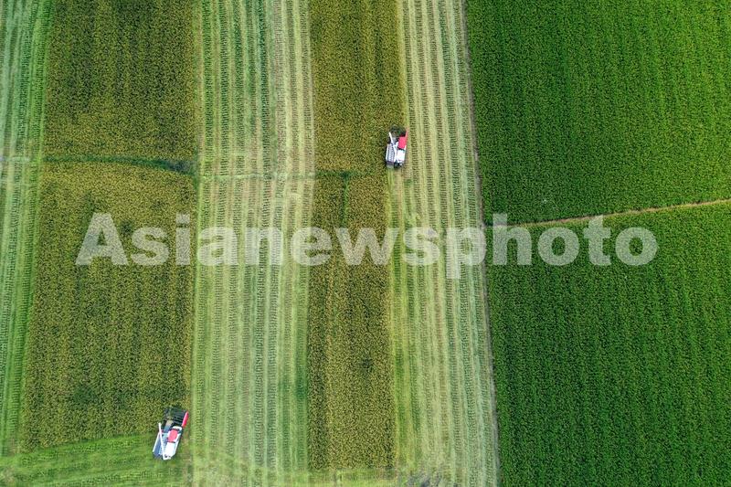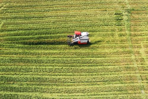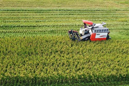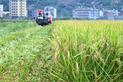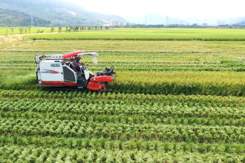 2022年8月16日,福建省福州市长乐区竹田村,收割机在稻田帮助村民收割水稻。