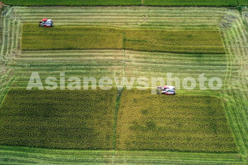 2022年8月16日,福建省福州市长乐区竹田村,收割机在稻田帮助村民收割水稻。