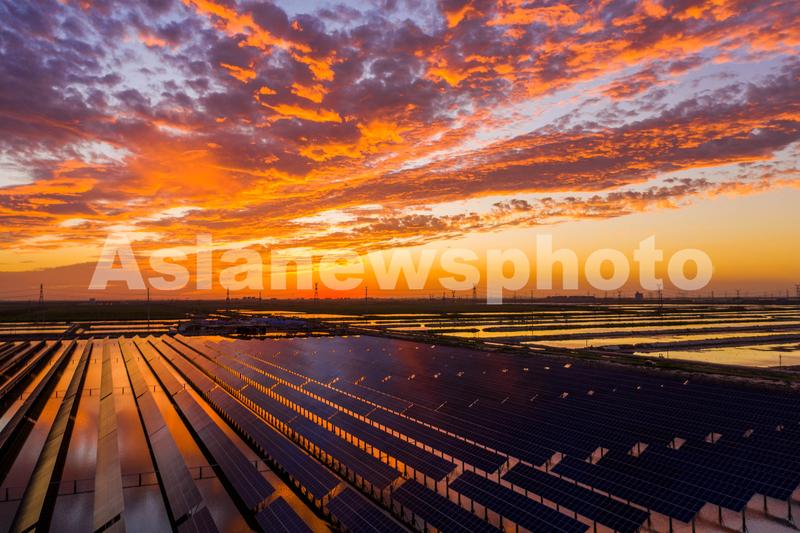 8月15日,在山东省滨州市无棣县的沿海滩涂上,晚霞映照下的光伏电站。