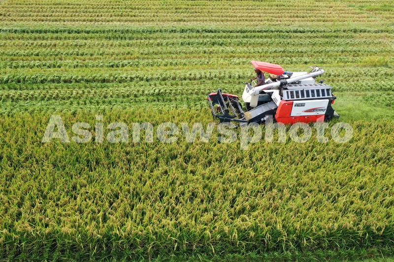 2022年8月16日,福建省福州市长乐区竹田村,收割机在稻田帮助村民收割水稻。