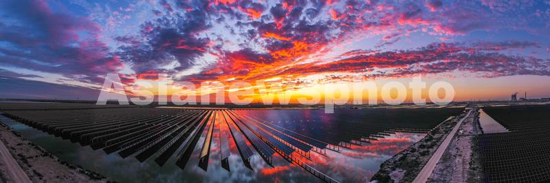 8月15日,在山东省滨州市无棣县的沿海滩涂上,晚霞映照下的光伏电站。