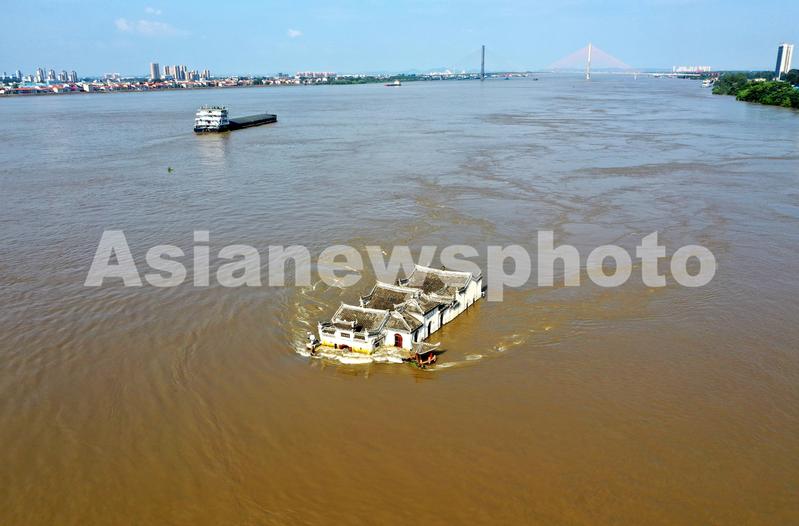 图片说明:2020年7月23日,长江2020年第2号洪水平稳通过长江武汉段。距离武汉70公里处的鄂州长江中的观音阁,大水已淹没观音阁大门前的挡水墙,激流中观音阁依旧屹立不倒。
