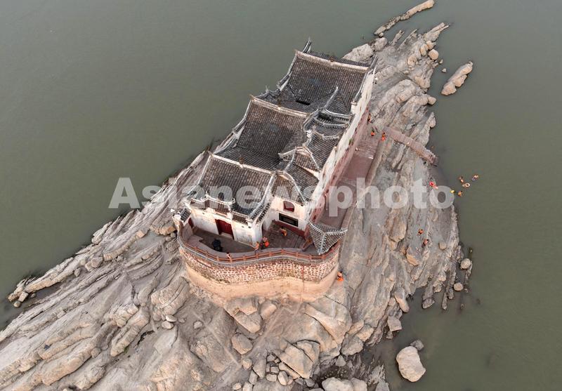 图片说明:2022年8月20日上午9时,长江汉口水位连续几天下降为16.72米,距离武汉70公里处的鄂州长江中的观音阁基石外露,与2020年长江汛情形成强烈反差。