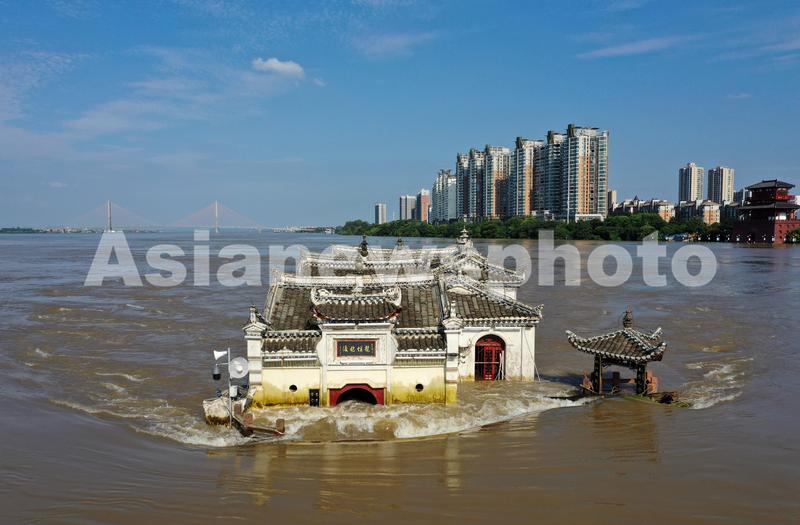 图片说明:2020年7月23日,长江2020年第2号洪水平稳通过长江武汉段。距离武汉70公里处的鄂州长江中的观音阁,大水已淹没观音阁大门前的挡水墙,激流中观音阁依旧屹立不倒。