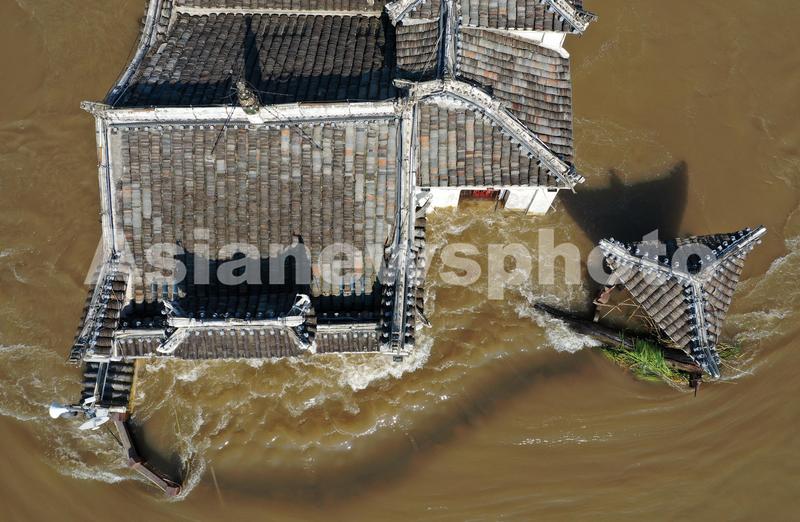 图片说明:2020年7月23日,长江2020年第2号洪水平稳通过长江武汉段。距离武汉70公里处的鄂州长江中的观音阁,大水已淹没观音阁大门前的挡水墙,激流中观音阁依旧屹立不倒。