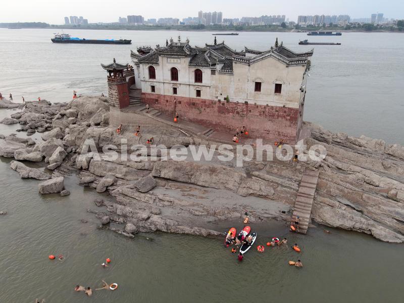 图片说明:2022年8月20日上午9时,长江汉口水位连续几天下降为16.72米,距离武汉70公里处的鄂州长江中的观音阁基石外露,与2020年长江汛情形成强烈反差。