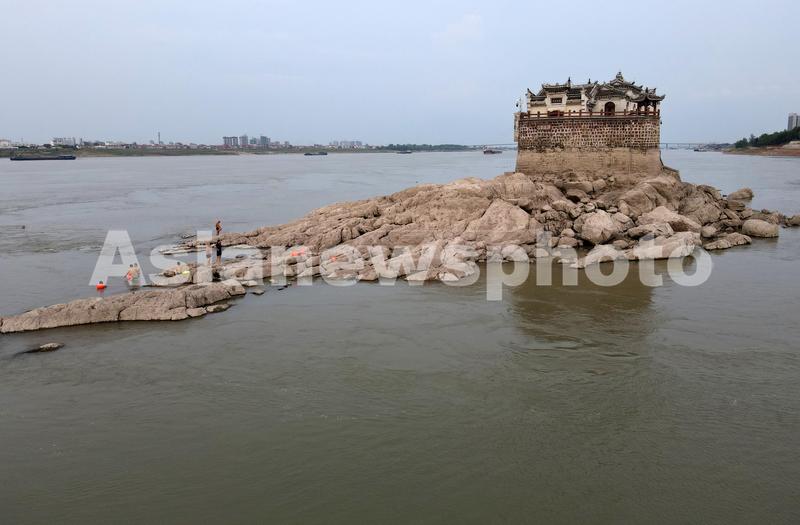 图片说明:2022年8月20日上午9时,长江汉口水位连续几天下降为16.72米,距离武汉70公里处的鄂州长江中的观音阁基石外露,与2020年长江汛情形成强烈反差。