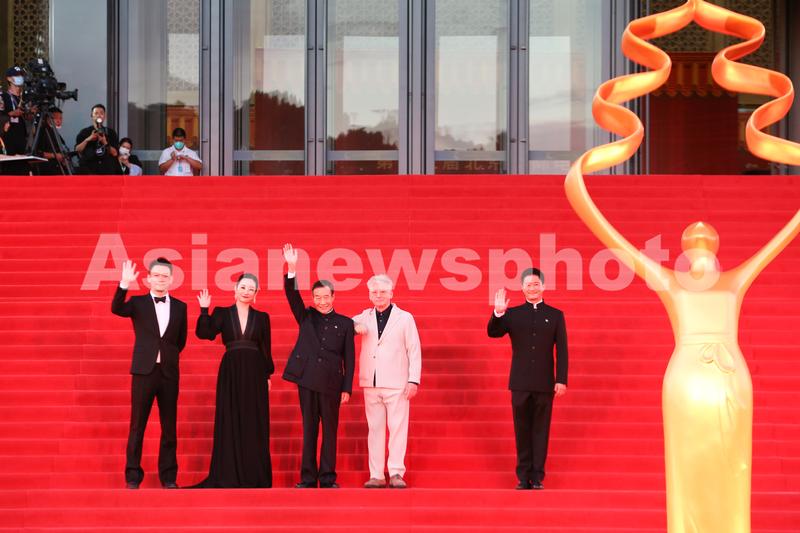 8月19日,本届北影节“天坛奖”评委会主席李雪健(中)、评委会成员郭帆、秦海璐、柯文思和吴京(从左至右)亮相闭幕红毯仪式。