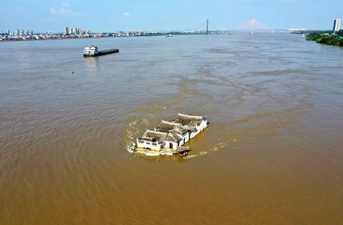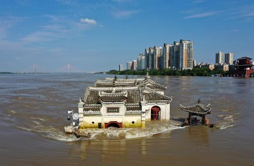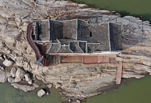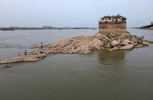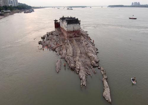 图片说明:2022年8月20日上午9时,长江汉口水位连续几天下降为16.72米,距离武汉70公里处的鄂州长江中的观音阁基石外露,与2020年长江汛情形成强烈反差。