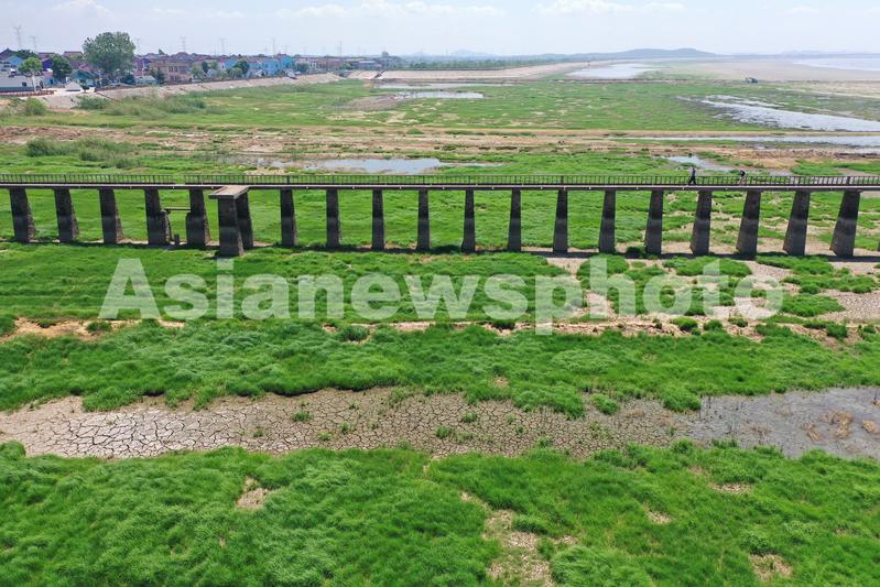 图片说明:2022年8月21日,江苏南京石臼湖露出大片滩涂。