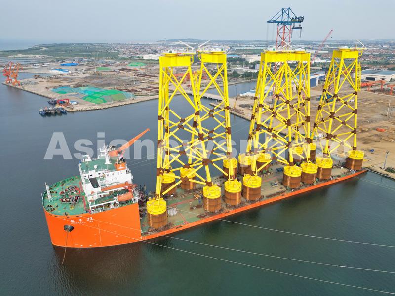 2022年8月18日,一批用于海上风电的吸力筒式导管架在山东烟台一家海工装备企业装船完毕,准备出口发运。