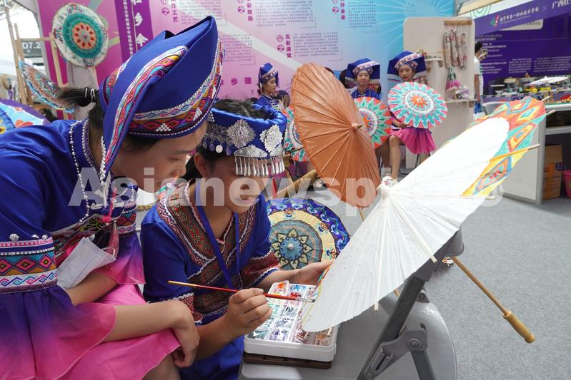 图片说明:8月19日,在南宁国际会展中心,广西师范大学附属中学的学生在展示油纸伞伞面绘图技艺。