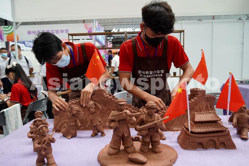 图片说明:8月19日,在南宁国际会展中心,钦州市第六中学的学生在展示“坭兴陶”制作技艺。