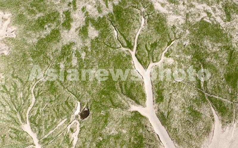 2022年8月21日,江西省鄱阳湖都昌小矶山水域,无人机拍摄的鄱阳湖干涸的湖床。航拍镜头下,鄱阳湖小矶山水域1个多月前烟波浩渺的景象消失不见,目及之处滩涂裸露,呈现出一棵“生命之树”景观。