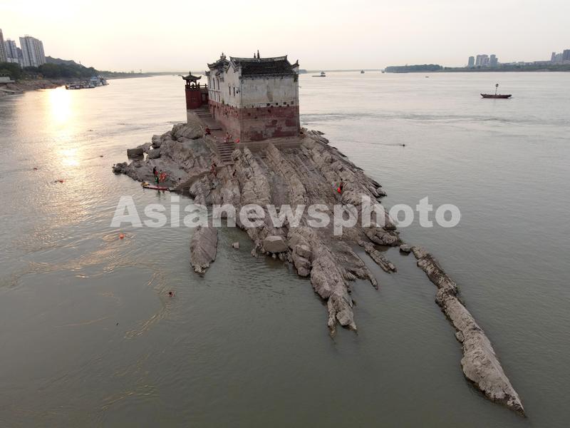 图片说明:2022年8月20日上午9时,长江汉口水位连续几天下降为16.72米,距离武汉70公里处的鄂州长江中的观音阁基石外露,与2020年长江汛情形成强烈反差。