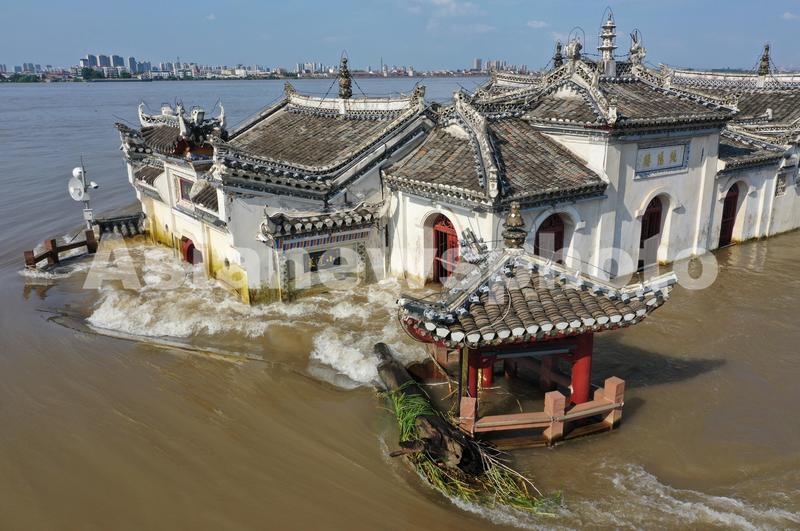图片说明:2020年7月23日,长江2020年第2号洪水平稳通过长江武汉段。距离武汉70公里处的鄂州长江中的观音阁,大水已淹没观音阁大门前的挡水墙,激流中观音阁依旧屹立不倒。
