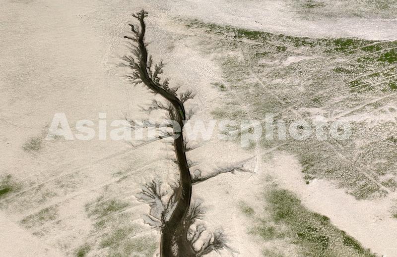 2022年8月21日,江西省鄱阳湖都昌小矶山水域,无人机拍摄的鄱阳湖干涸的湖床。航拍镜头下,鄱阳湖小矶山水域1个多月前烟波浩渺的景象消失不见,目及之处滩涂裸露,呈现出一棵“生命之树”景观。