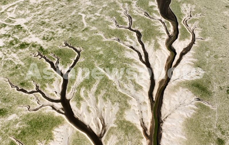 2022年8月21日,江西省鄱阳湖都昌小矶山水域,无人机拍摄的鄱阳湖干涸的湖床。航拍镜头下,鄱阳湖小矶山水域1个多月前烟波浩渺的景象消失不见,目及之处滩涂裸露,呈现出一棵“生命之树”景观。