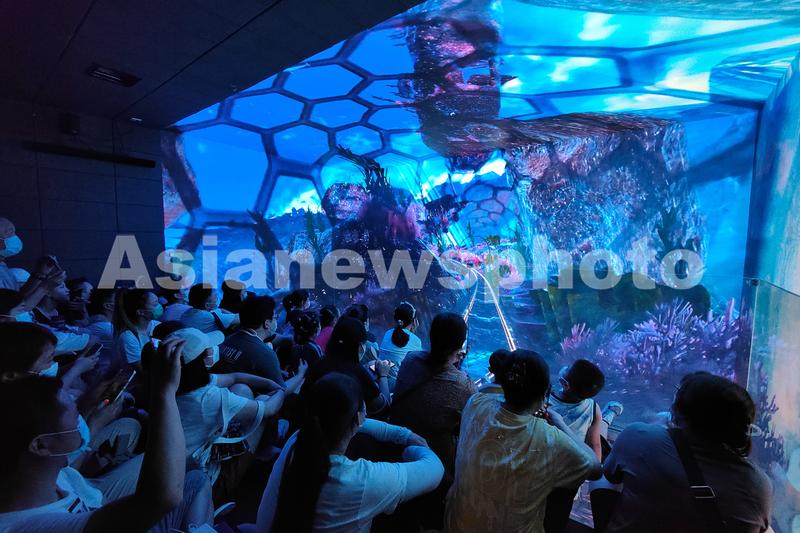 图片说明:2022年8月22日,上海,当日中午,观众在一商场5楼的“悬空玻璃艺术馆”内参观和拍照打卡。