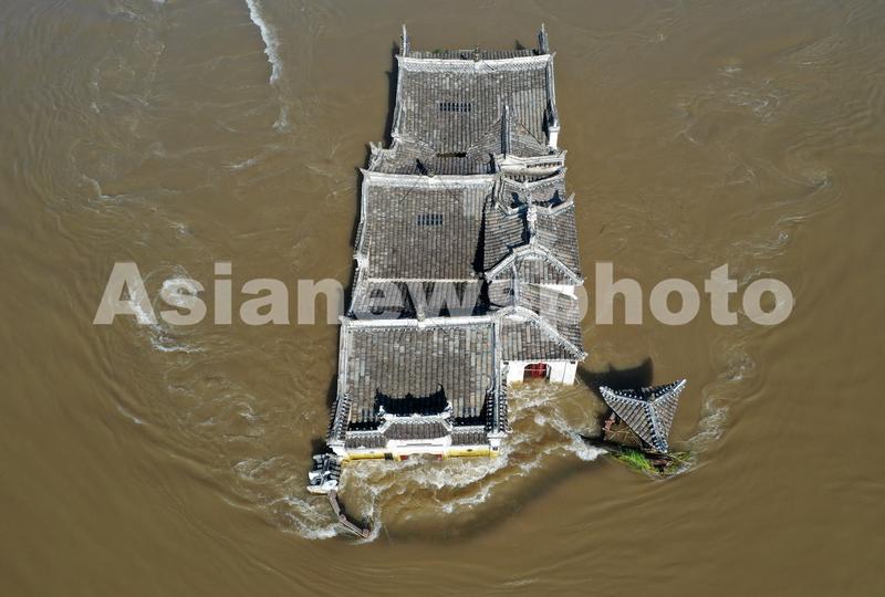 图片说明:2020年7月23日,长江2020年第2号洪水平稳通过长江武汉段。距离武汉70公里处的鄂州长江中的观音阁,大水已淹没观音阁大门前的挡水墙,激流中观音阁依旧屹立不倒。