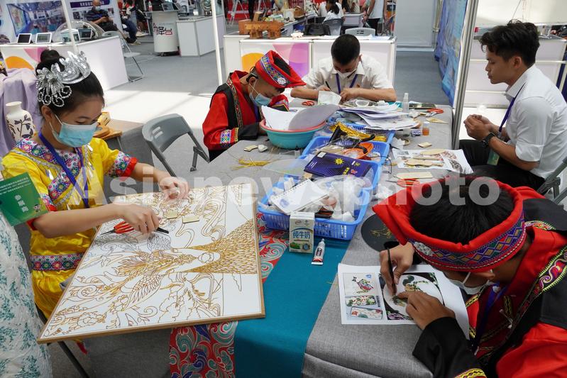 图片说明:8月19日,在南宁国际会展中心,百色市特殊教育学校的学生在展示“掐丝绘画”技艺。