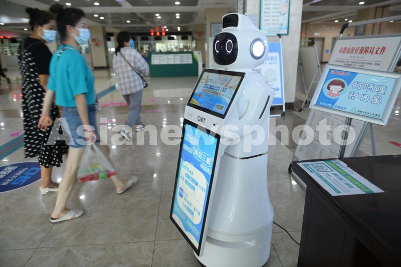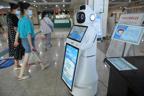 2022年8月17日,安徽省阜阳市第五人民医院门诊大厅里智能导诊机器人吸引市民目光。